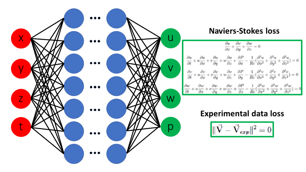 - Physics loss: residual of the PDE (e.g., Navier–Stokes) evaluated at collocation points.